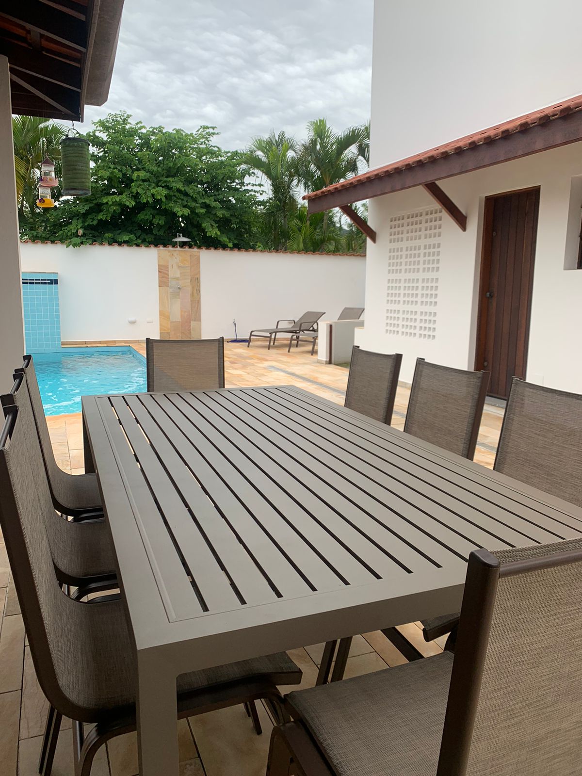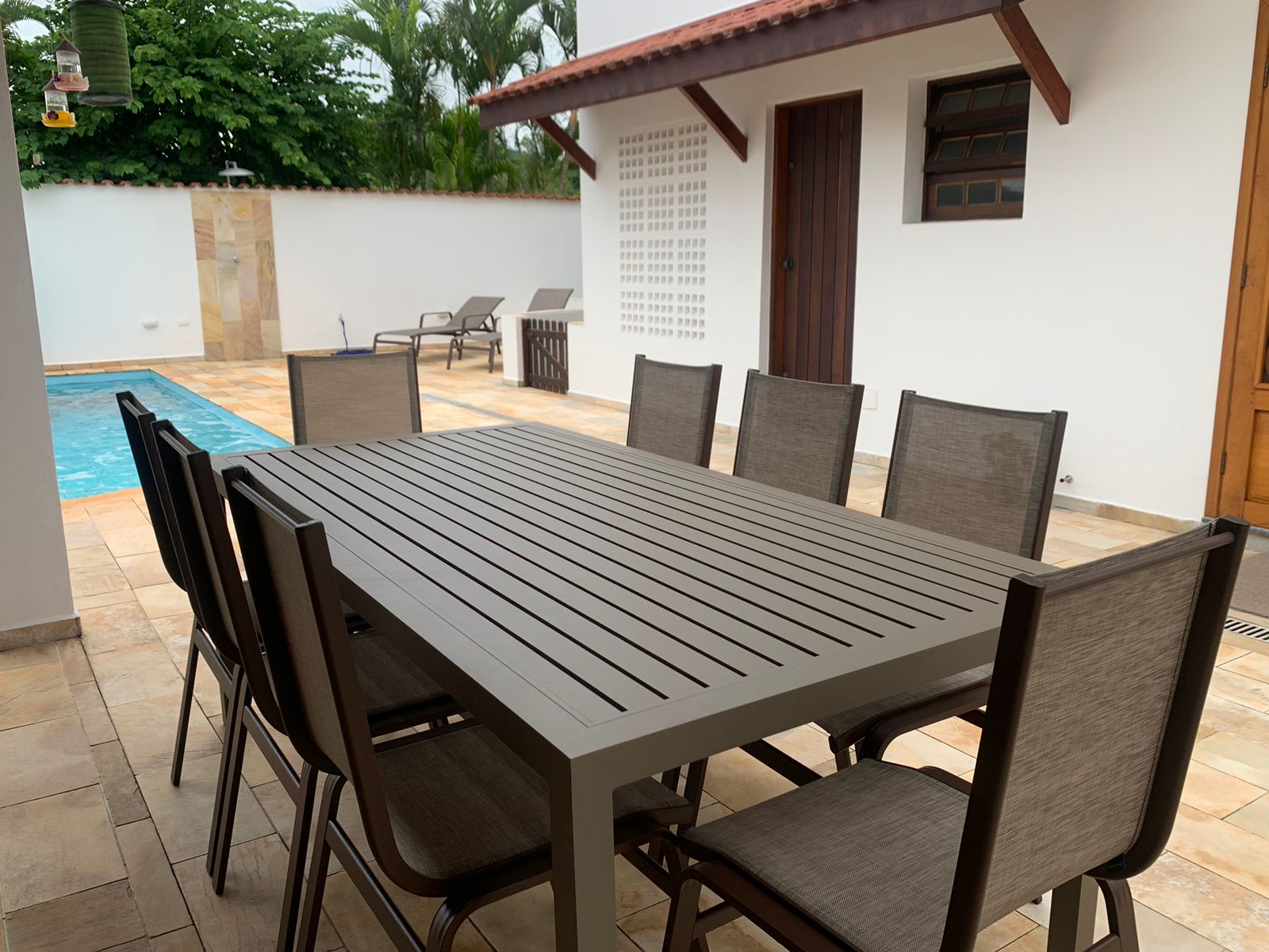 Conjunto Grécia em alumínio para 8 lugares com design clean e totalmente voltado para áreas externas. A mesa com tampo em alumínio ripado oferece alta resistência, fácil manutenção e excelente durabilidade contra sol e umidade. As cadeiras em tela sling garantem conforto, leveza visual e secagem rápida, tornando o uso prático no dia a dia. Uma opção moderna, funcional e elegante para compor varandas, áreas gourmet e espaços de lazer.